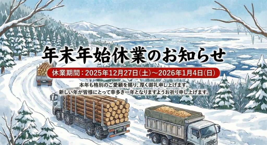 平素は格別のご高配を賜り、厚く御礼申し上げます。 本年も、オホーツク管内を中心に、原木・チップ輸送をはじめとする貨物運送事業を通じて、地域の皆様に大変お世話になりました。誠に勝手ながら、弊社では以下の期間を年末年始休業とさせていただきます... -